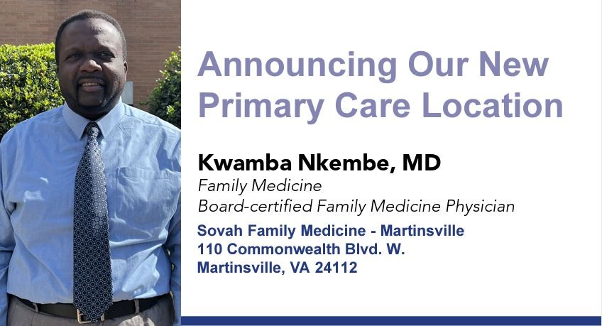 June 20, 2023Sovah Physician Practices is happy to announce our new clinic: Sovah Family Medicine - Martinsville. Dr. Kwamba Nkembe and staff will begin seeing patients age 2 and older at 110 Commonwealth Blvd. W. starting June 26.